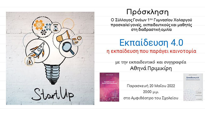 Ο Σύλλογος Γονέων του 1ου Γυμνασίου Χολαργού διοργανώνει συζήτηση για γονείς, εκπαιδευτικούς και μαθητές με θέμα «Εκπαίδευση 4.0, η Εκπαίδευση που παράγει καινοτομία» την Παρασκευή 20 Μαίου 2022 στις 20.00 μμ στην αίθουσα εκδηλώσεων του σχολείου.